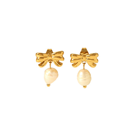 18Kゴールドメッキステンレススチールドロップイヤリングパールボウノットデザイナーフープイヤリング休日のための女性のジュエリー